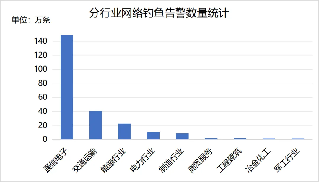 2025年8月,安全运营中心依托国资国企网络信息安全在线监管平台,共监测到网络钓鱼告警237.3万条,涉及74家中央企业单位。告警数量前三的行业为通信电子、交通运输、能源行业,告警数量分行业统计情况如下。本月,交通运输行业网络钓鱼告警数量增长明显,建议相关中央企业提高警惕加强防范。