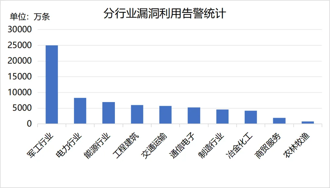 2025年8月,安全运营中心依托国资国企网络信息安全在线监管平台,监测到漏洞利用告警7.3亿条,涉及798家中央企业单位,告警数量排名前三的行业为军工行业、电力行业、能源行业,告警数量分行业统计情况如下。本月,工程建筑行业告警数量增长较多。