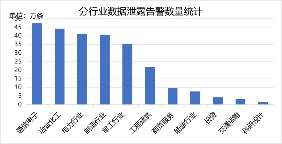 2025年8月,安全运营中心在常规网络流量监测之外,从可能发生数据泄露的场景出发,利用敏感系统特征、域名前缀特征、流量传输特征等信息,对包括数据存储类、ETL工具(即数据提取、转换、加载工具)、数据管理类、查询应用类、分析计算类、数据监控类等6大类共112种应用开展监测分析。本月共监测到数据泄露告警256.7万余条,涉及377个应用、283家中央企业单位。告警数量前三的行业为通信电子、冶金化工、电力行业。