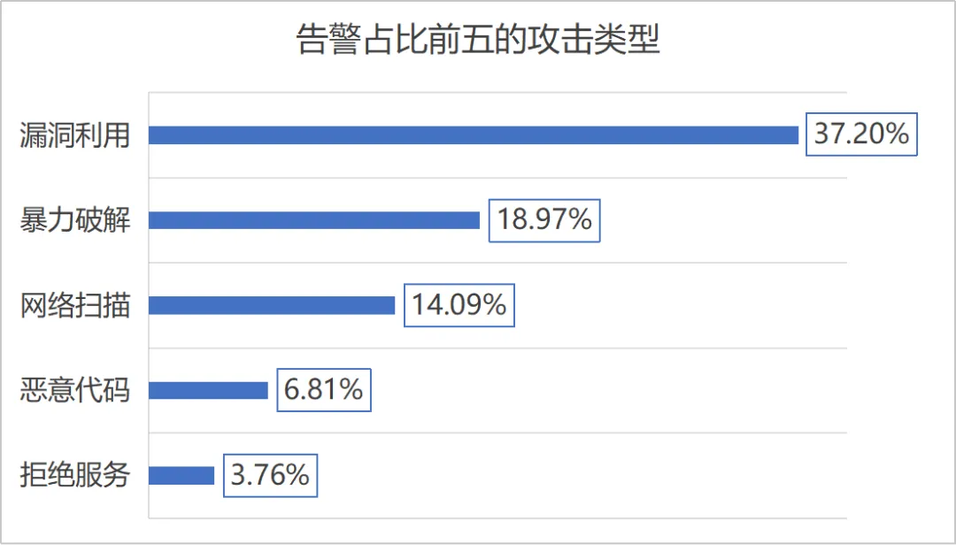 8月,中央企业排名前三的告警类型分别为漏洞利用、暴力破解、网络扫描,告警占比如下图所示。
