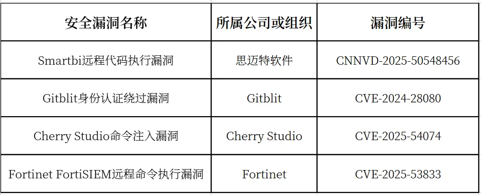 2025年8月,安全运营中心共收集安全漏洞96个,其中涉及面较广且较为严重的安全漏洞4个,如下表所示。
