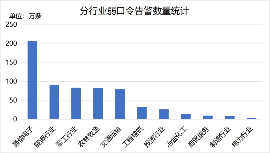 口令破解是攻击者突破中央企业边界网络防护的主要手段之一,安全运营中心持续对中央企业弱口令使用情况进行监测并及时反馈。2025年8月共监测到弱口令告警641.0万条,涉及699家中央企业单位,告警数量前三的行业为通信电子、能源行业、军工行业,告警数量分行业统计情况如下。本月弱口令告警总量较上月明显增加。