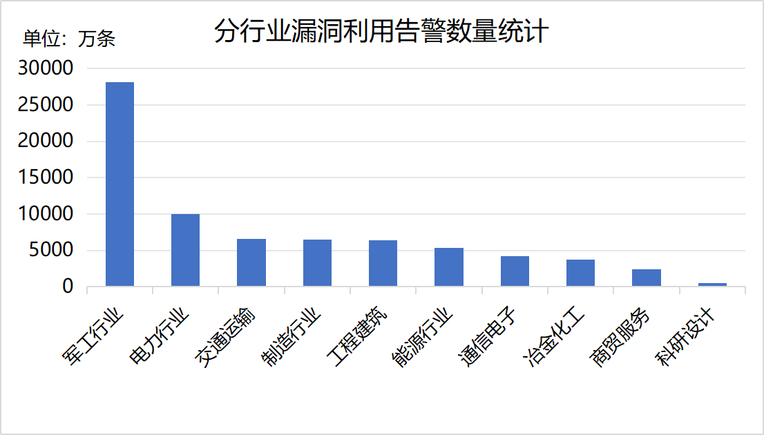 2025年11月,安全运营中心依托国资国企网络信息安全在线监管平台,监测到漏洞利用告警7.7亿条,涉及779家中央企业,告警数量排名前三的行业为军工行业、电力行业和交通运输,告警数量分行业统计情况如下。本月,军工行业告警数量增长较多。