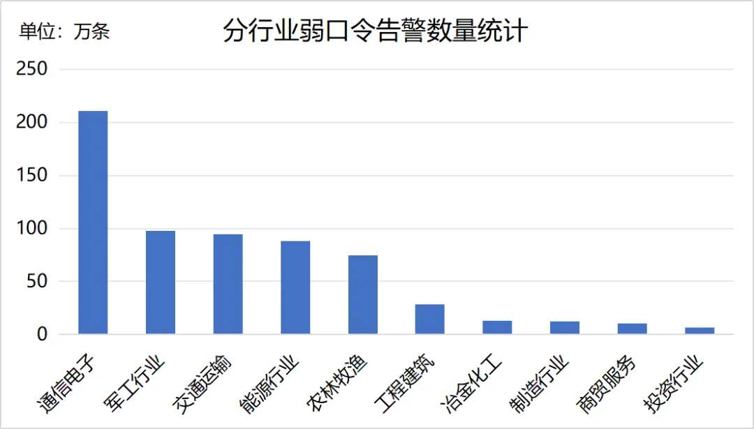 口令破解是攻击者突破中央企业边界网络防护的主要手段之一,安全运营中心持续对中央企业弱口令使用情况进行监测并及时反馈。2025年10月共监测到弱口令告警698.8万条,涉及671家中央企业单位,告警数量前三的行业为通信电子、能源行业、农林牧渔,告警数量分行业统计情况如下。本月弱口令告警总量较上月有所减少。
