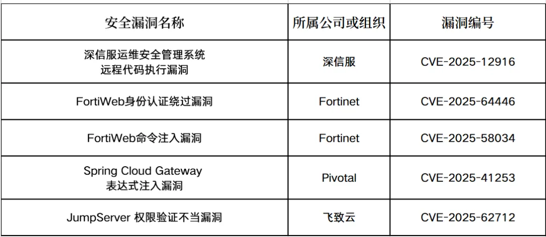 2025年11月,安全运营中心共收集安全漏洞60个,其中涉及面较广且较为严重的安全漏洞5个,如下表所示。