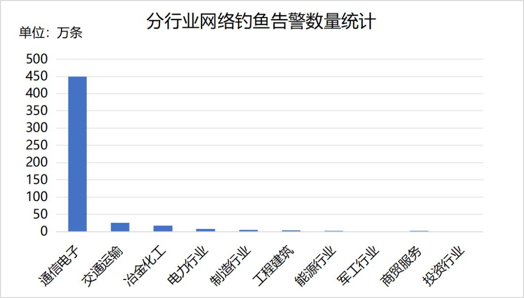 2025年11月,安全运营中心依托国资国企网络信息安全在线监管平台,共监测到网络钓鱼告警513.8万条,涉及133家中央企业。告警数量前三的行业为通信电子、交通运输和冶金化工,告警数量分行业统计情况如下。本月,通信电子网络钓鱼告警数量增长明显,建议相关中央企业提高警惕加强防范。