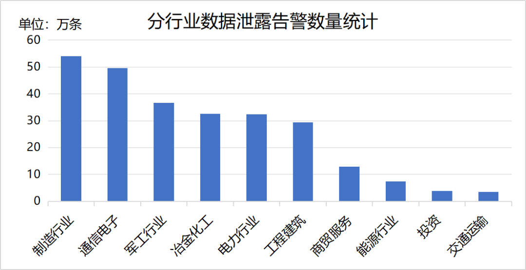 2025年11月,安全运营中心在常规网络流量监测之外,从可能发生数据泄露的场景出发,利用敏感系统特征、域名前缀特征、流量传输特征等信息,对包括数据存储类、ETL工具(即数据提取、转换、加载工具)、数据管理类、查询应用类、分析计算类、数据监控类等6大类共112种应用开展监测分析。本月共监测到数据泄露告警264.6万条,涉及391个应用、285家中央企业。告警数量前三的行业为制造行业、通信电子和军工行业,告警数量分行业统计情况如下。