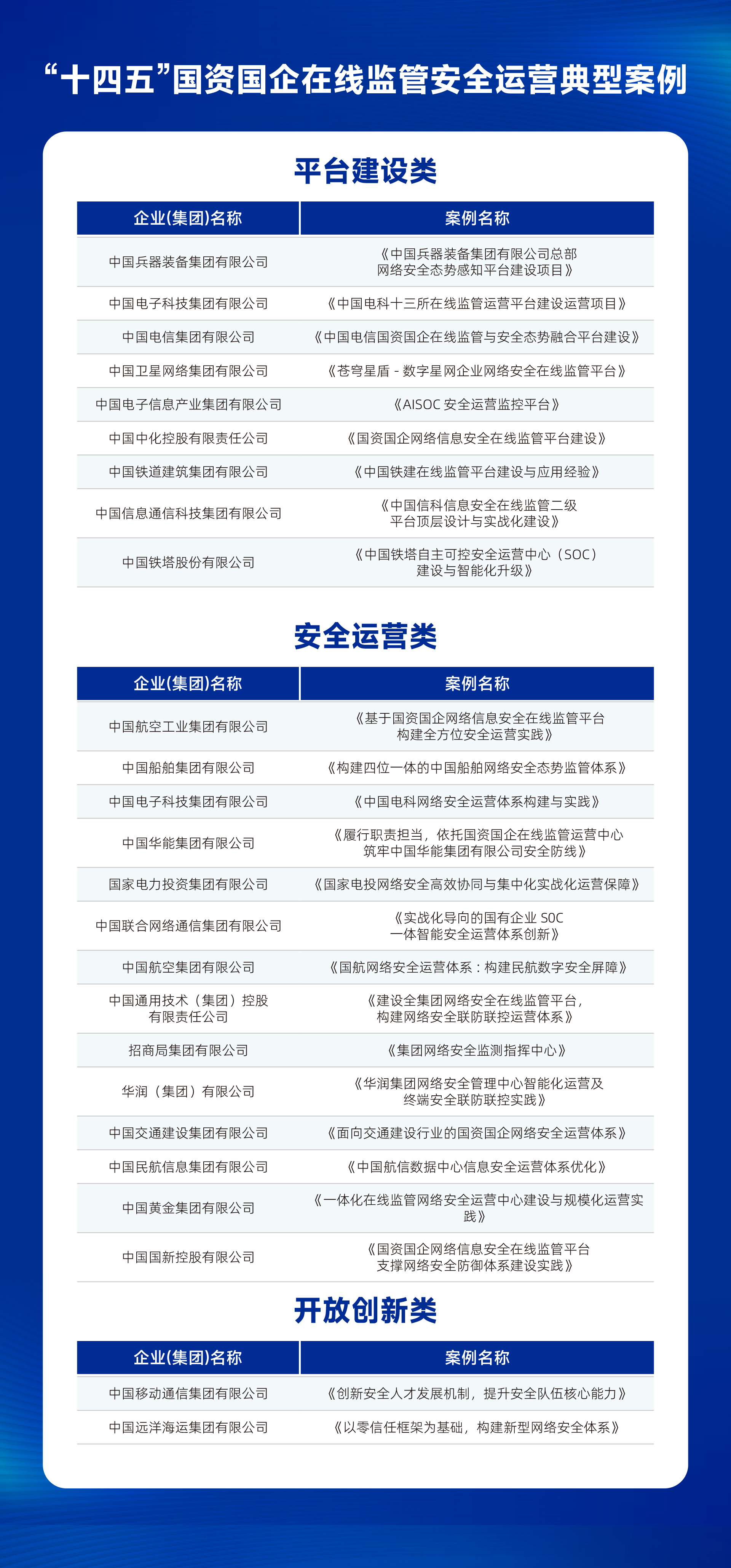 为全面总结国资国企安全运营“十四五”期间建设成果和实践经验,系统谋划“十五五”时期国资国企在线监管安全运营体系建设任务,按照国务院国资委有关工作部署要求,结合国资国企网络信息安全在线监管平台(以下简称平台)建设推进情况,国资国企在线监管安全运营中心(以下简称安全运营中心)组织开展了“十四五”国资国企在线监管安全运营典型案例和先进个人事迹评选活动,在网安科创联盟专家严格评审的基础上,经安全运营中心党委会讨论并报请上级机关批准,从中央企业和部分地方国有企业申报的100多个案例中,精选出25家单位的典型优秀案例和59名“十四五”安全运营工作先进个人,现予发布。
